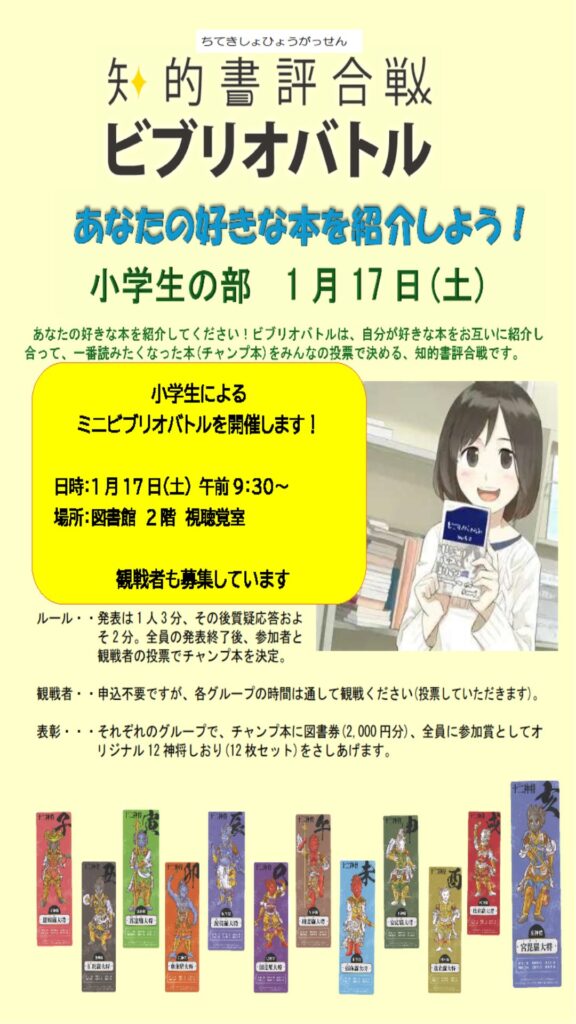 延期となっておりました、ミニビブリオバトル「小学生の部」の開催が決定いたしましたのでお知らせいたします。
